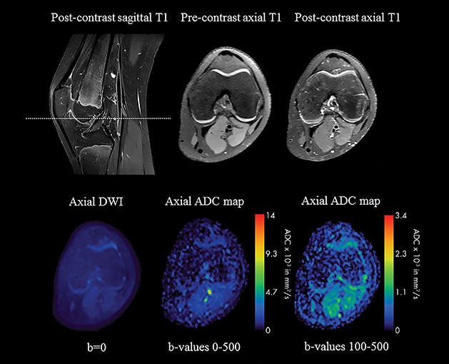 The research team conducted a prospective study of 45 patients ages 6 to 18 who underwent pre- and post-contrast MRI of the knee with an additional DWI sequence between 2015 and 2018. For the clinical reference standard, a multidisciplinary team determined the presence or absence of arthritis on the basis of clinical, laboratory and imaging findings, excluding DWI. The two data sets were then scored by two radiologists blinded to all clinical data.
