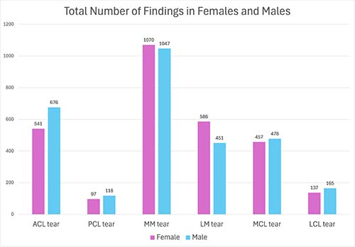 Analysis of the MRI reports revealed that specific injuries were observed more often in men compared to women, including ACL tears alone, ACL tear with medial meniscal tear or ACL tear with lateral meniscal tear.