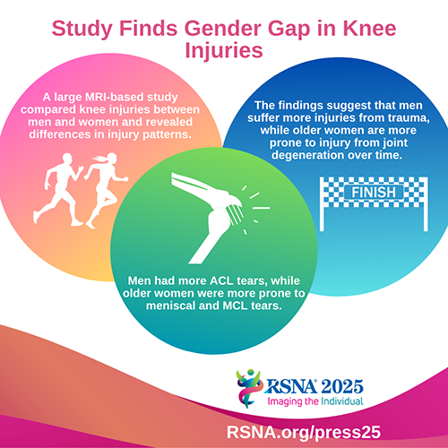 “In recent years, we've grown more interested in the differences in knee injuries between men and women,” said study co-author Jenifer Pitman, M.D., assistant professor of radiology at Johns Hopkins Medical Institute in Baltimore, Maryland. “The majority of past research has focused on men, but as we expand our focus to include women, the more we see that they have different risk profiles and are prone to different injuries.”