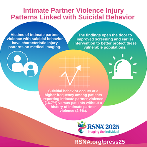 Review of reports by two experienced emergency radiologists revealed that both intimate partner violence and suicidal behavior played independent roles in doubling the overall injury rate compared to that of patients without a history of intimate partner violence or suicidal behavior. Patients with intimate partner violence often sustained head, face, neck and upper limb injuries—areas commonly hurt during assaults.