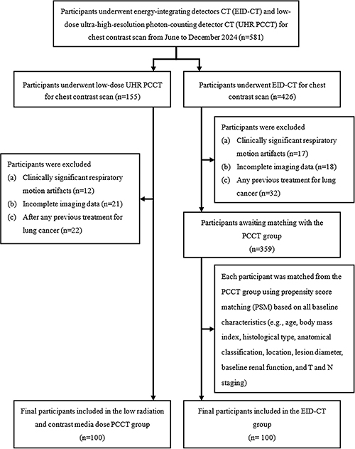 The researchers formed two study groups of 100 individuals, matched on 13 parameters, including weight, age, histological type, T-staging and kidney function. The first group of 100 (61 males, mean age 61) underwent low-dose photon-counting CT, and in the second group (65 males, mean age 61) underwent conventional CT.