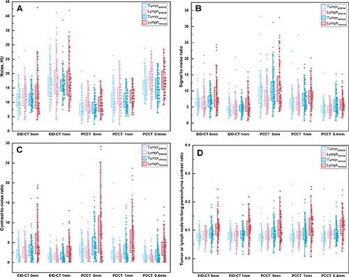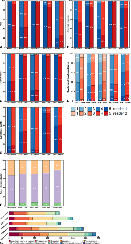 A radiologist experienced in chest imaging performed measurements using a 5-point Likert scale to analyze lesion image quality, malignant radiological features, diagnostic confidence, BMI subgroup and tumor size. Two experienced chest radiologists independently evaluated the noise, anatomical structures, lesion sharpness, structures within enhanced lesions and overall image quality.