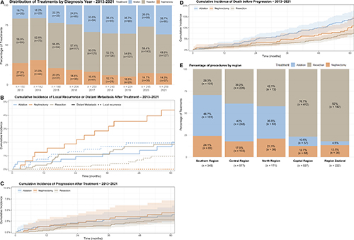 Distant metastasis—the spread of cancer cells to distant organs or lymph nodes—occurred more frequently in patients who underwent nephrectomy (4.38%) than in those who underwent resection and ablation (1.90% and 1.67%, respectively). Ablation patients had the shortest hospital stays, with most returning home the same day. They also had the fewest 30-day post-treatment hospital contacts, suggesting fewer complications.