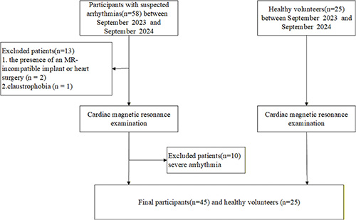 The study cohort included 25 healthy volunteers and 45 patients with suspected arrhythmias. Each participant underwent cine imaging with both conventional cine MRI and AI-CS single-shot cine sequences.