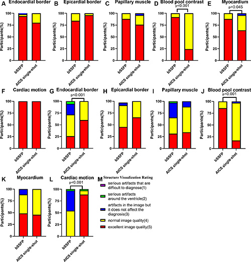 Three cardiovascular radiologists, blinded to clinical information and prior imaging results, independently analyzed the images, assessing artifacts and the visibility of cardiac structures.