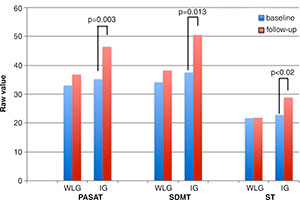 Twenty-four MS patients with cognitive impairment were randomly assigned to either take part in an eight-week, home-based rehabilitation program—consisting of 30-minute gaming sessions, five days per week—or be put on a wait list, serving as the control group. Patients were evaluated by cognitive tests and by 3-Tesla resting state functional MRI (RS-fMRI) at baseline and after the eight-week period. Functional imaging when the brain is in its resting state, or not focused on a particular task, provides important information on neural connectivity.