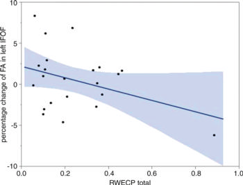 The brain's white matter is composed of millions of nerve fibers called axons that act like communication cables connecting various regions of the brain. Diffusion tensor imaging produces a measurement, called fractional anisotropy (FA), of the movement of water molecules in the brain and along axons. In healthy white matter, the direction of water movement is fairly uniform and measures high in FA. When water movement is more random, FA values decrease, which has been associated with brain abnormalities in some studies.