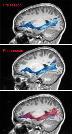 The study participants underwent pre- and post-season evaluation with multimodal neuroimaging, including diffusion tensor imaging (DTI) of the brain. DTI is an advanced MRI technique, which identifies microstructural changes in the brain's white matter. In addition, all games and practices were video recorded and reviewed to confirm the accuracy of the impacts.