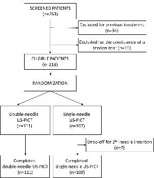 Ultrasound exams were performed on each patient to identify the exact location of calcium deposits in the tendons and whether the deposit appeared to be hard or fluid. For patients in the double-needle procedure group, 16-gauge needles were inserted inside the calcification under continuous ultrasound monitoring, and the area was flushed with injections and extractions of saline until the tendon was free of visible calcium. The single-needle procedure utilized an 18-gauge needle for the injection and extraction.