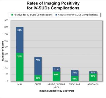For the study, Dr. Flores and colleagues looked at the prevalence and type of complications related to substance use disorders in patients arriving at Emergency Radiology. The study group included 1,031 patients imaged from 2005 to 2016 for substance use-related complications. Of all the patients, 66 percent were men, 78 percent were white and the mean age was 36 years.