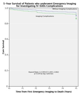 Overall, 121 of the 1,031 patients, or 11.7 percent, died before the end of the study period. The mortality rate was 14 percent for patients with a positive imaging diagnosis of substance-abuse-related complications – significantly higher than the 10 percent rate for patients with no such history. Five-year mortality rates were also higher in patients with prior opioid prescriptions and with imaging complications.