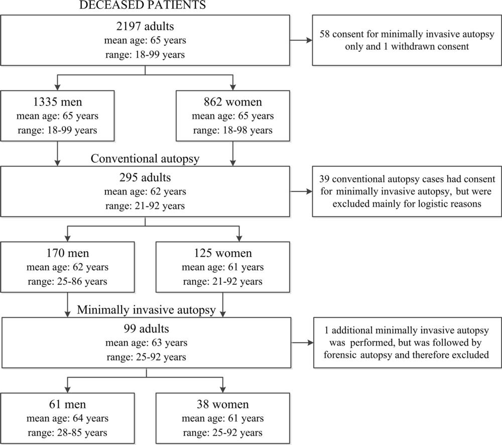 The total number of diagnoses established by minimally invasive autopsy was higher than that of regular autopsy. The deceased patients had a total of 288 major diagnoses related to the consensus cause of death, and minimally invasive autopsy diagnosed 259 of those, or 90 percent, compared with 78 percent for conventional autopsy.