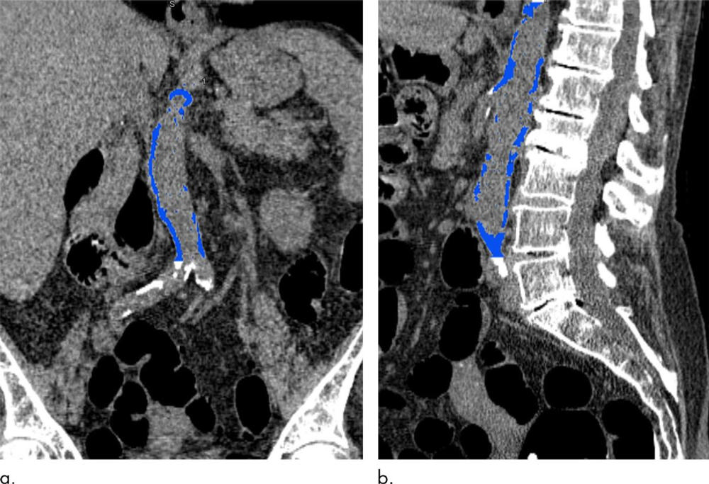 CT can also measure calcium in the abdominal aorta, the large vessel that carries oxygenated blood to the lower extremities. The abdominal aorta can be seen on abdominal imaging exams like CT colonography, also known as virtual colonoscopy, and in the diagnostic workup for acute cholecystitis, an inflammation of the gallbladder often caused by gallstones.
