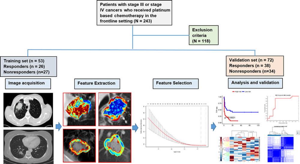 They analyzed data from 125 patients who had been treated with pemetrexed-based platinum doublet chemotherapy at Cleveland Clinic. The patients were divided randomly into two sets with an equal number of responders and non-responders in the training set. The training set comprised 53 patients with NSCLC, and the validation set comprised 72 patients.