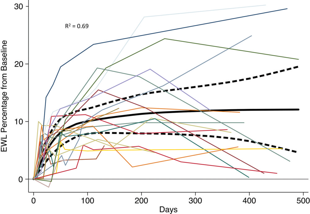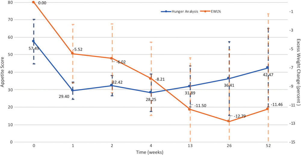 - Patients maintained weight loss of 11.5 percent after a year, as well as a decrease in hunger levels.