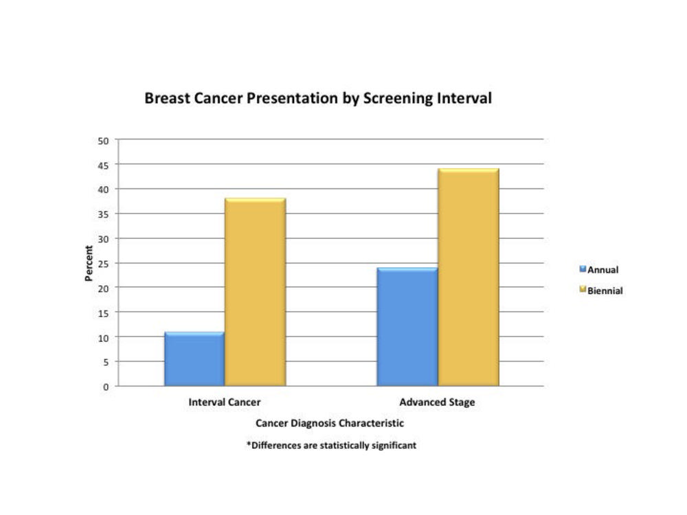 - Almost half of women in the biennial screening group had late-stage cancers, compared with only a quarter of women in the annual screening group.