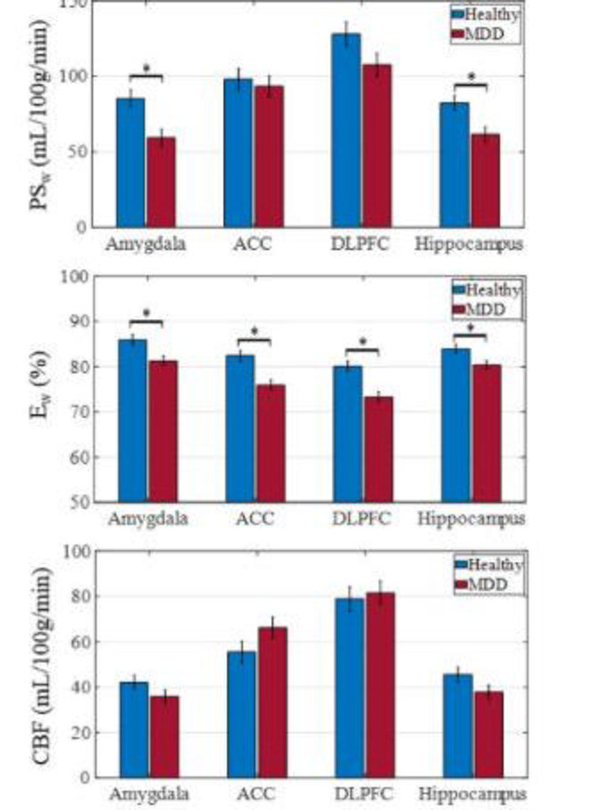 Comparison of results in 14 healthy individuals and 14 MDD patients found that less water moved from inside the blood vessels to outside in the MDD patients, representing disrupted BBB integrity. This difference was particularly large in two regions of the brain: the amygdala and the hippocampus.