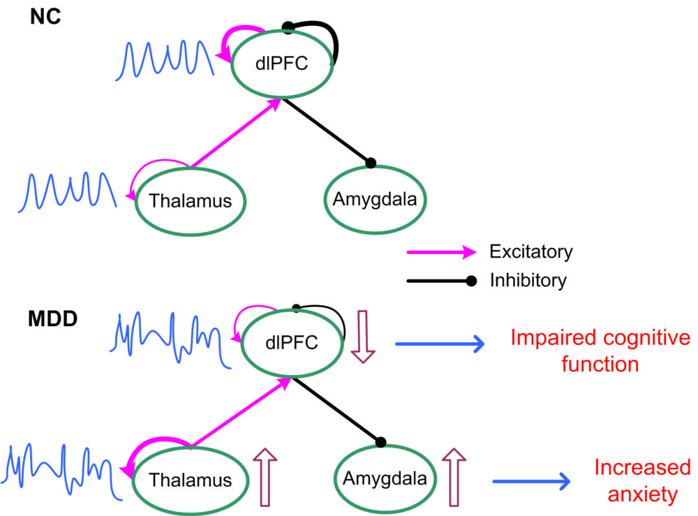 Patients with MDD had abnormal patterns of excitation and inhibition at the dorsal lateral prefrontal cortex, a brain area important to cognitive control functions, including the regulation of the amygdala, a key region embedded deep in the brain for expression of emotion. It has long been hypothesized that malfunctioning inhibitory control over the amygdala could result in depressive symptoms.