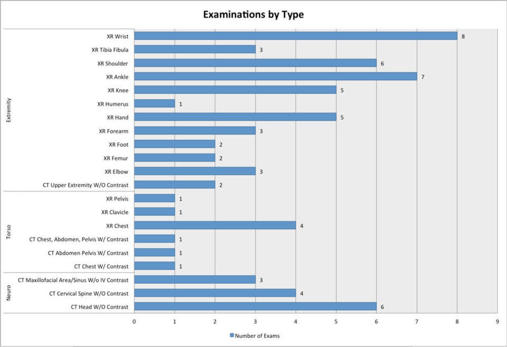 The researchers identified 69 exams performed on 36 unique Emergency Department patients with involvement of an e-scooter. There were 19 males and 17 females included in the study, and two-thirds were in the 18-30 age range. X-rays of the extremities and CT of the head, face and cervical spine were the most common exams ordered.