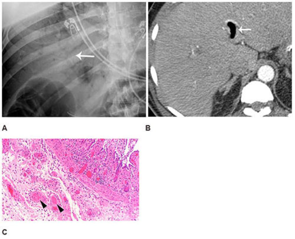 Records showed that 17% of patients had cross-sectional abdominal imaging, including 44 ultrasounds, 42 CT scans, and 1 MRI. Bowel abnormalities were seen on 31% of CT scans (3.2% of all patients) and were more frequent in intensive care unit (ICU) patients than other inpatients. Bowel findings included thickening and findings of ischemia such as pneumatosis (gas in the bowel wall) and portal venous gas. Surgical correlation in four patients revealed unusual yellow discoloration of bowel in three of the patients, and bowel infarction (dead bowel) in two patients.