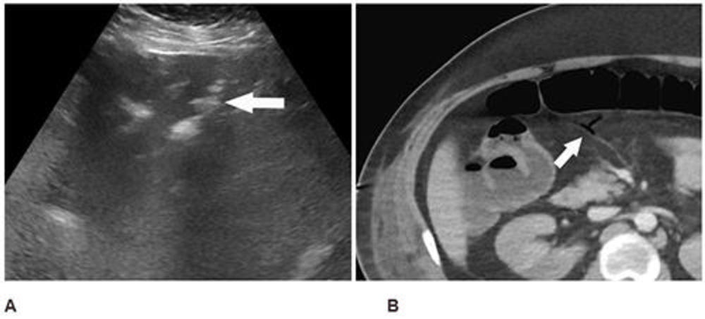 In two patients who had bowel resection, pathology demonstrated ischemia with patchy necrosis (injury due to reduced arterial flow with patchy areas of cell death). Both had fibrin thrombi (blood clots) in submucosal arterioles (small arteries in the bowel wall), suggesting bowel ischemia in these patients might be caused by these small blood clots. Lung base findings led to a diagnosis of COVID-19 in one patient who presented with abdominal symptoms only. Of right upper quadrant ultrasounds, 87% were performed for liver laboratory findings, and 54% demonstrated a dilated sludge-filled gallbladder suggestive of cholestasis, or a decrease in bile flow.