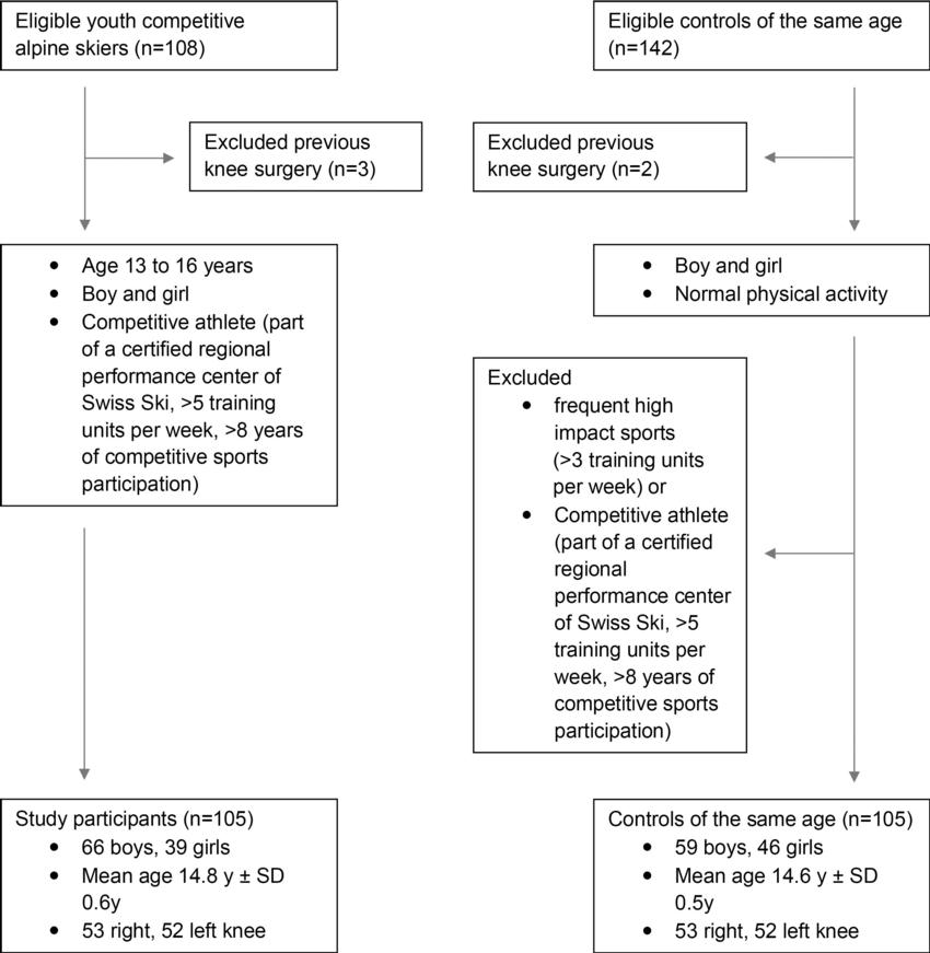 - Researchers compared the knee MRIs of 105 youth competitive alpine skiers with those of 105 controls.