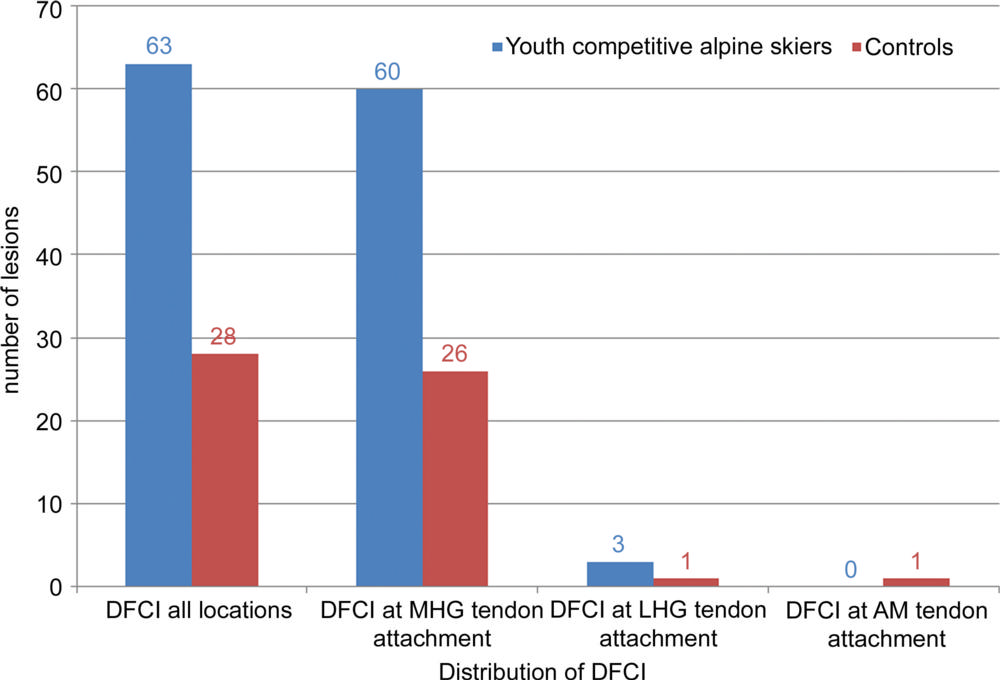 DFCIs were observed at the attachment sites of tendons, predominantly at the inside head of the gastrocnemius muscle for both skiers and controls.