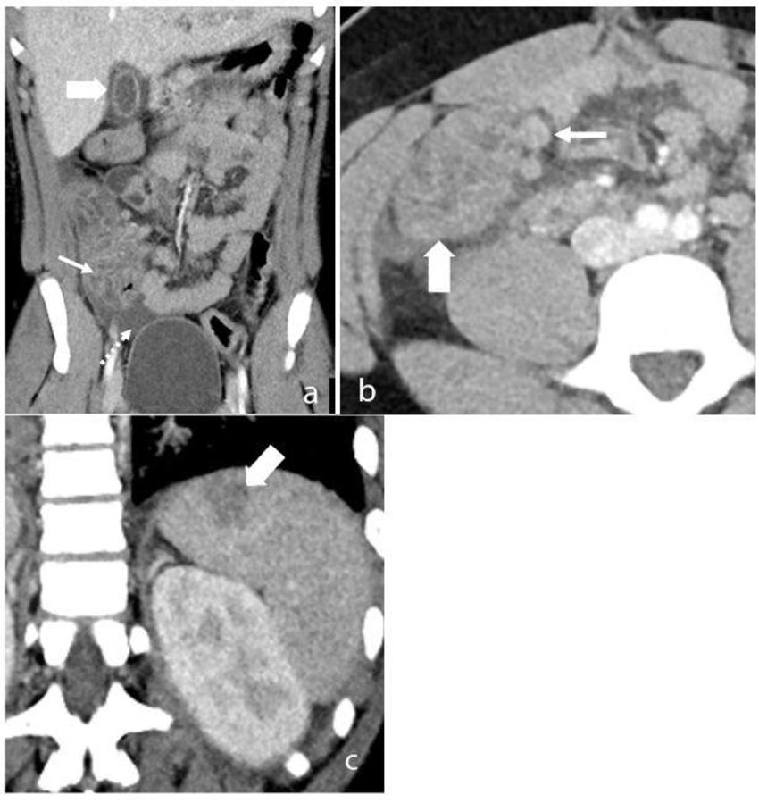 Abdominal ultrasound findings included inflammatory changes within the right iliac fossa, with mesenteric fat stranding, lymphadenopathy and bowel wall thickening, as well as free fluid in the pelvis.