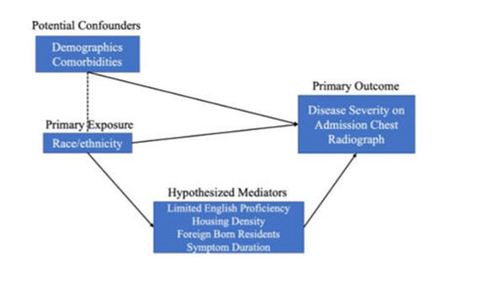 As expected, the increased severity of lung disease on chest X-rays among non-white patients correlated with a combination of factors, including delay in seeking care at the hospital, higher prevalence of pre-existing comorbidities and limited English proficiency.