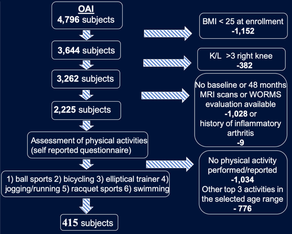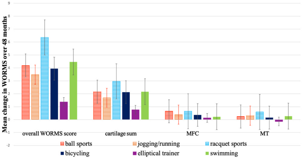 Study participants kept detailed records of their participation in six different types of physical activity, including ball sports, bicycling, jogging/running, elliptical trainer, racket sports and swimming. The researchers performed baseline MRIs and then measured changes in the patients’ knees over four years using the modified Whole-Organ Magnetic Resonance Imaging Score (WORMS). A higher score indicates more degeneration.