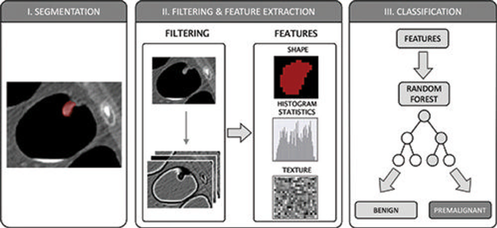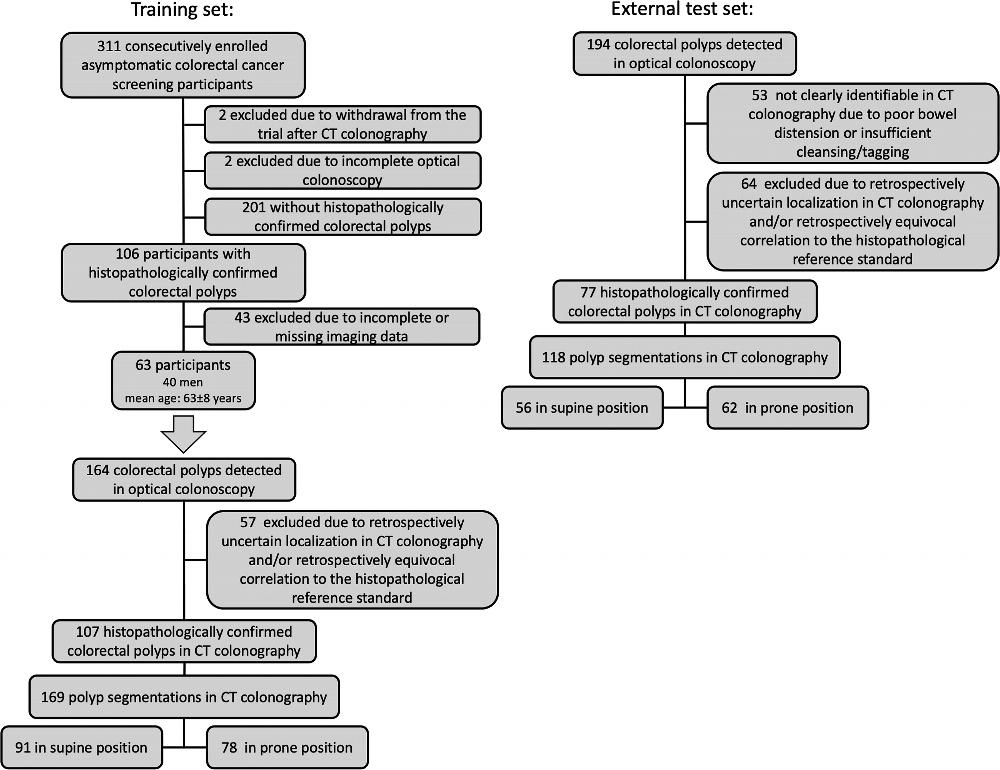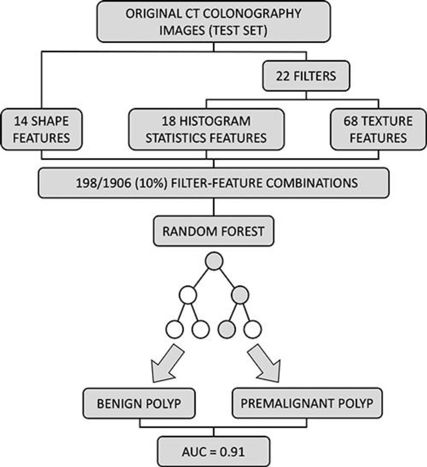 The researchers developed a machine learning algorithm to predict the character of the individual polyps based on quantitative image features extracted through radiomics. They applied the noninvasive, radiomics-based machine learning method on CT colonography images from a group of asymptomatic patients at average risk of colorectal cancer. The machine learning algorithm was trained on a set of more than 100 colorectal polyps in 63 patients and then tested on a set of 77 polyps in 59 patients.
