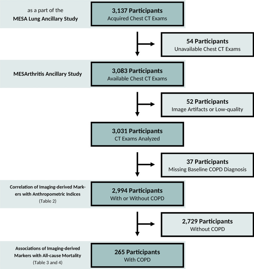 The study group was made up of 2,994 participants drawn from the Multi-Ethnic Study of Atherosclerosis (MESA), a large trial investigating the roles of imaging-derived soft-tissue and bone markers for predicting outcomes relevant to cardiopulmonary diseases. Of the 265 patients in the study group with COPD, 49 (18%) died over the follow-up period.