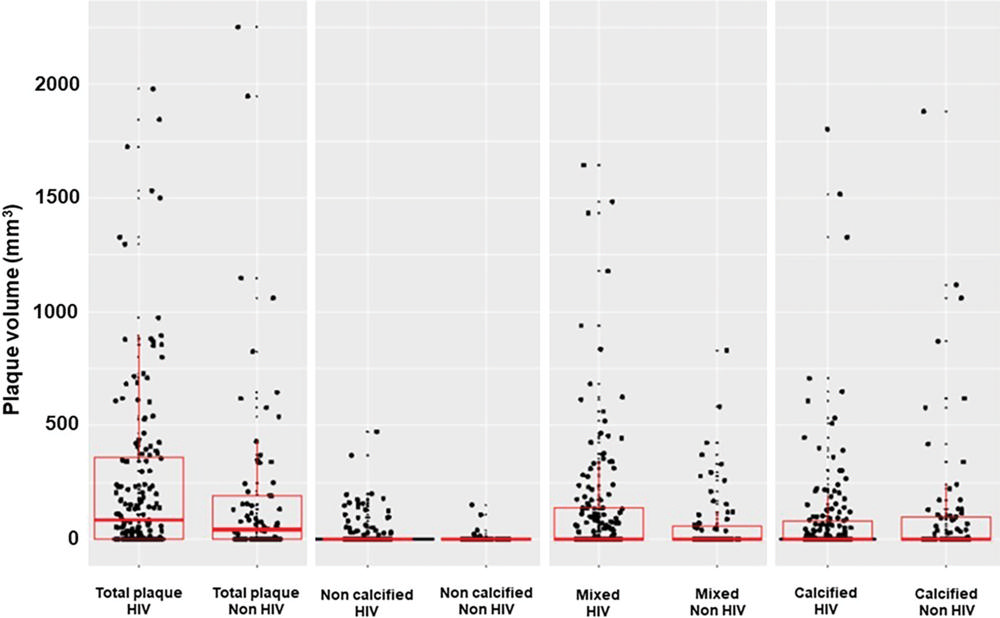 However, noncalcified plaque prevalence and volume were two to three times higher at coronary CT angiography in people living with HIV compared with non-HIV healthy volunteers after adjustment for cardiovascular risk factors. Noncalcified plaque may be more prone to rupture than calcified plaque.