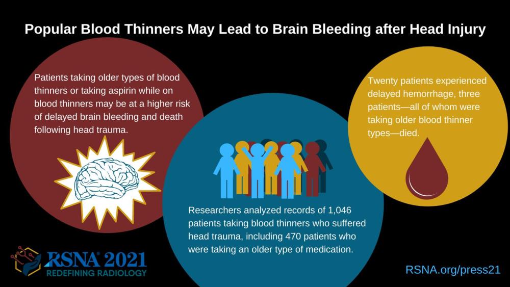 CHICAGO — A three-year study of more than 1,000 patients found that the risk of delayed intracranial hemorrhage and death following head trauma was significantly higher for adults taking older blood thinning medications including clopidogrel (Plavix) and warfarin (Coumadin), according to research being presented today at the annual meeting of the Radiological Society of North America (RSNA). Taking aspirin concurrently with any blood thinner may increase the risk of delayed hemorrhage.