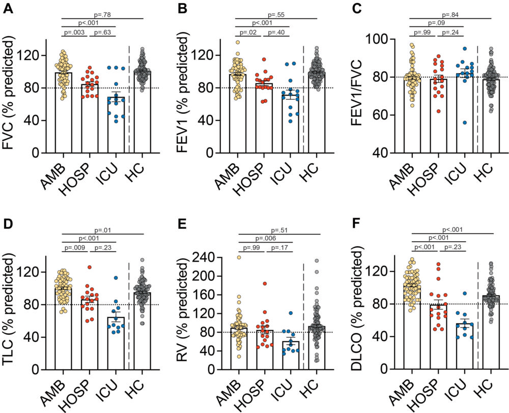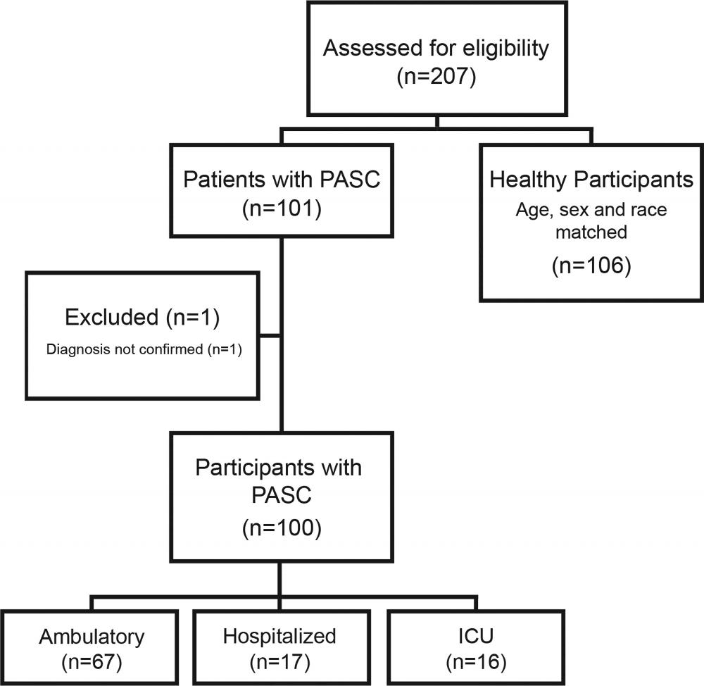 For the study, the researchers compared CT findings in people who had COVID-19 and persistent symptoms with those of a healthy control group. They enrolled 100 adults with confirmed COVID-19 who had remained symptomatic more than 30 days following diagnosis, along with 106 healthy participants. The 100 COVID-19 survivors, median age 48 years, included 67 who were classified as ambulatory, or not requiring hospitalization, 17 who were hospitalized, and 16 who required care in the intensive care unit (ICU) during acute infection.