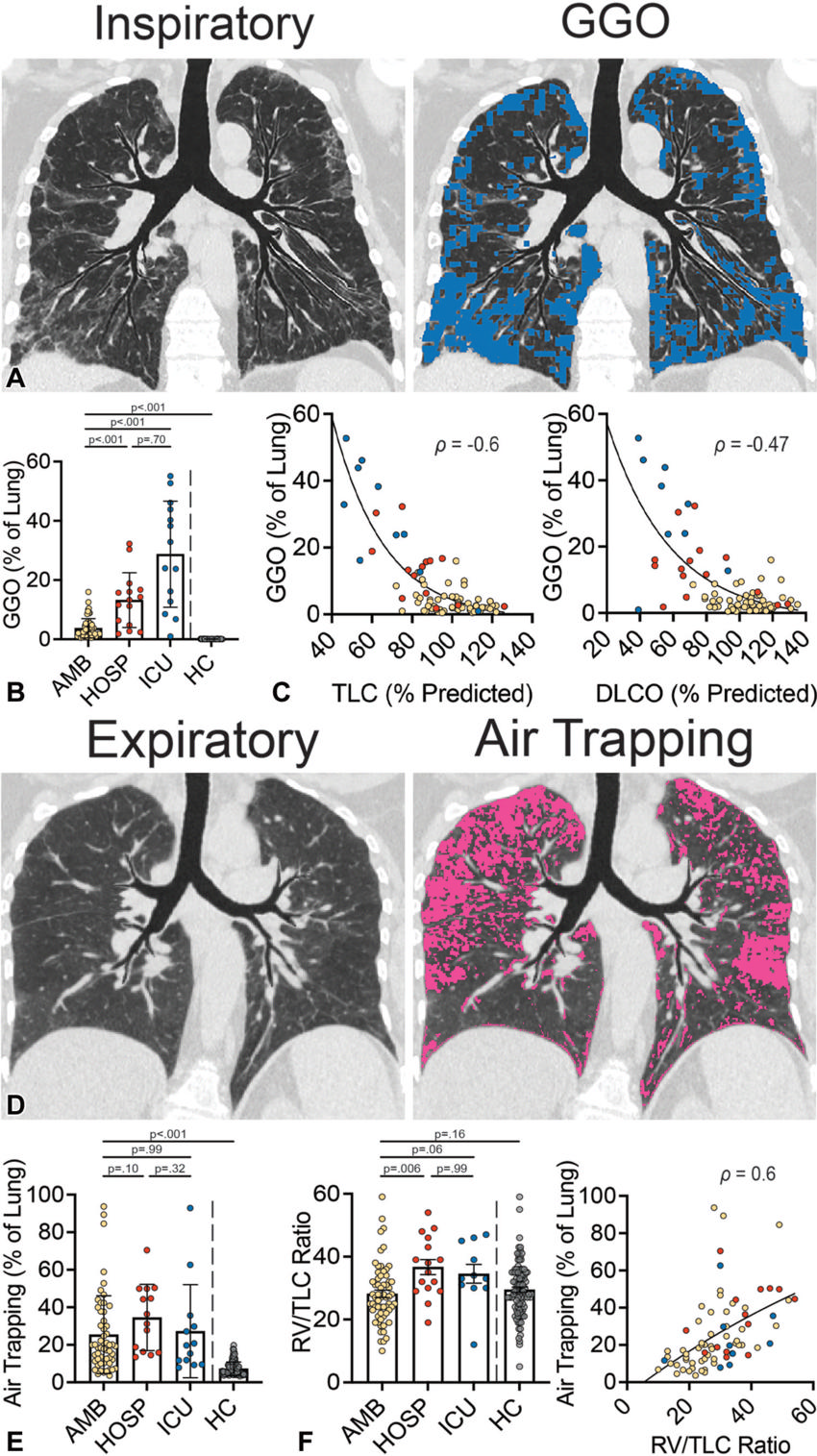 - The percentage of lung affected by air trapping was similar across COVID-19 severity groups and persisted in 8 of 9 participants who were imaged more than 200 days after diagnosis.