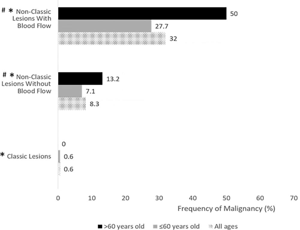 The frequency of malignancy was less than 1% in lesions with classic ultrasound features. In contrast, lesions that had a solid component with blood flow had a malignancy frequency of 32% in the overall study group and 50% in study participants who were more than 60 years old.