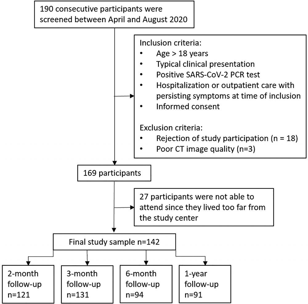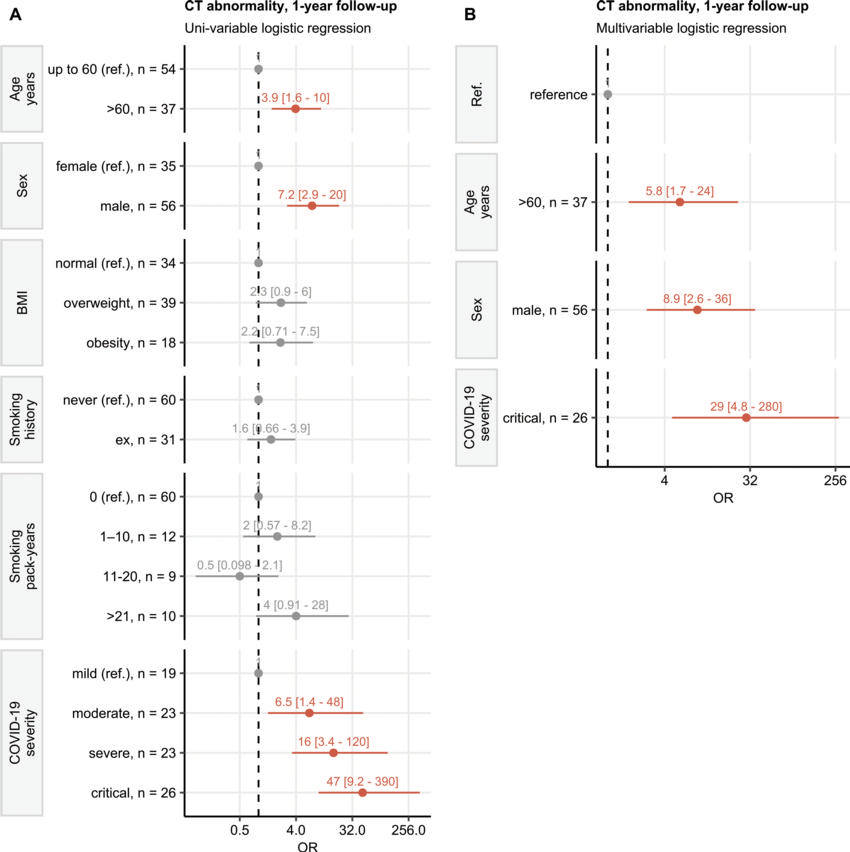 While CT abnormalities decreased in initial follow-ups, 63% of participants with abnormalities did not show any further improvement after six months. Age over 60 years, critical COVID-19 severity and male gender were associated with persistent CT abnormalities at one year.