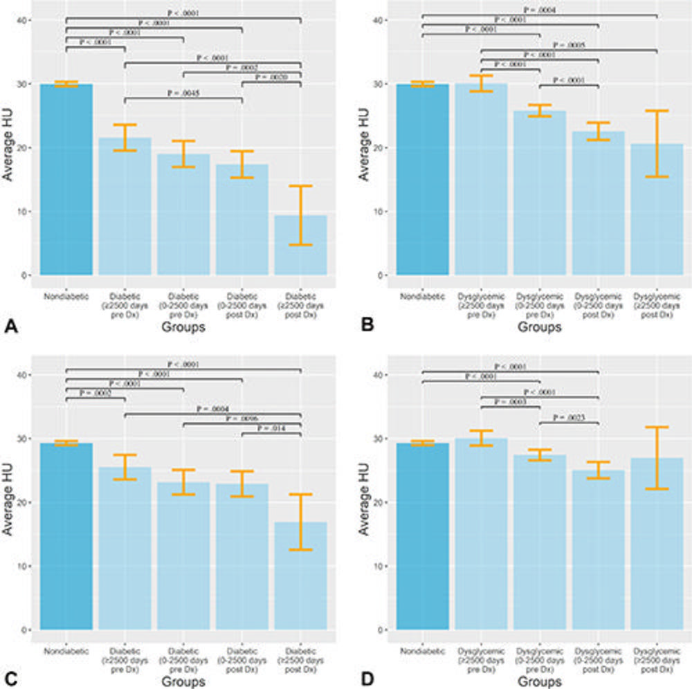 For this retrospective study, Dr. Summers and colleagues, in close collaboration with co-senior author Perry J. Pickhardt, M.D., professor of radiology at the University of Wisconsin School of Medicine & Public Health, used a dataset of patients who had undergone routine colorectal cancer screening with CT at the University of Wisconsin Hospital and Clinics. Of the 8,992 patients who had been screened between 2004 and 2016, 572 had been diagnosed with type 2 diabetes and 1,880 with dysglycemia, a term that refers to blood sugar levels that go too low or too high. There was no overlap between diabetes and dysglycemic diagnosis.