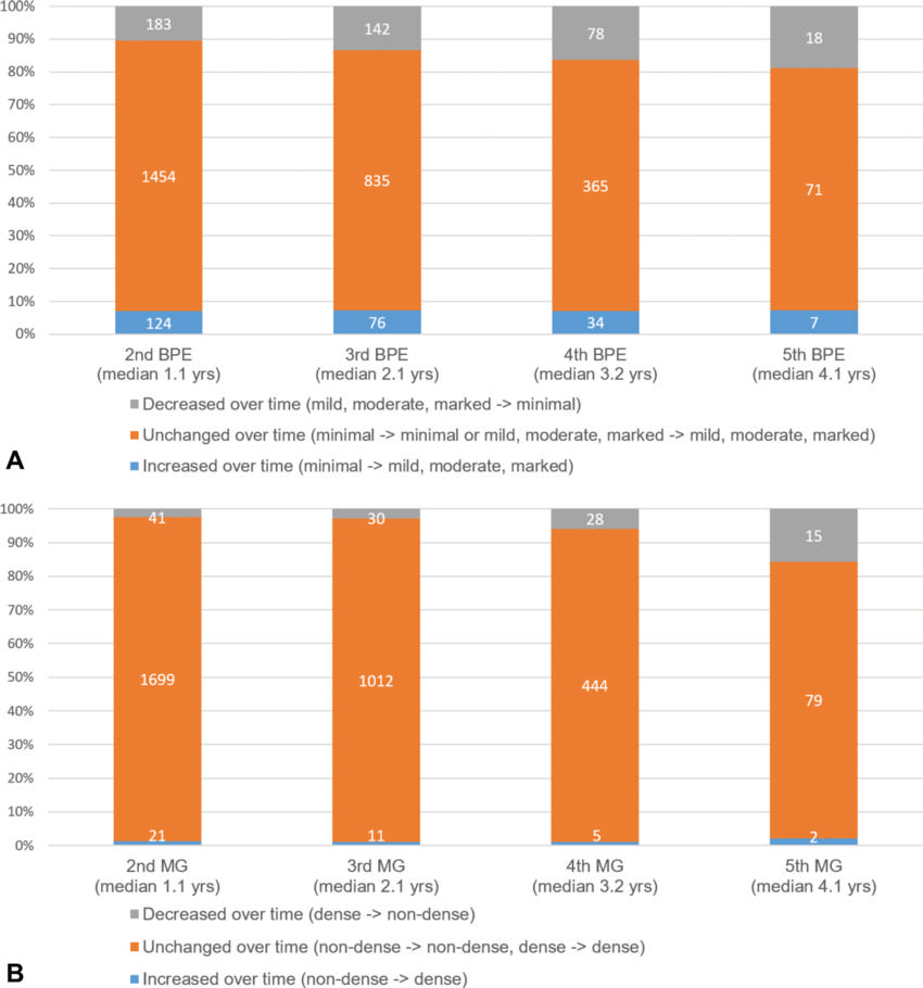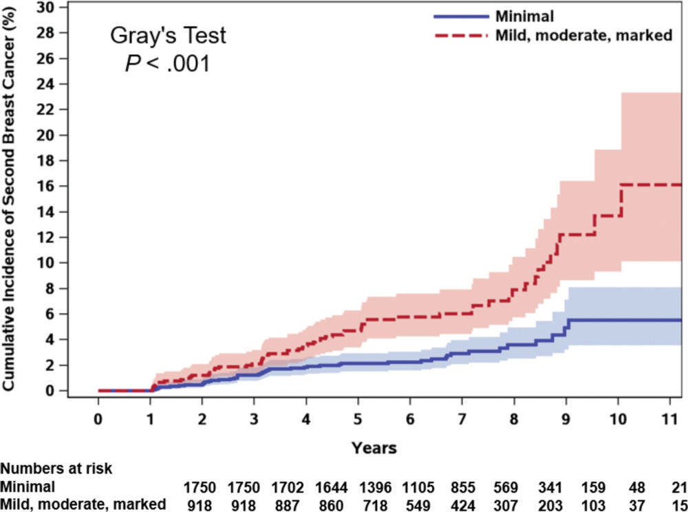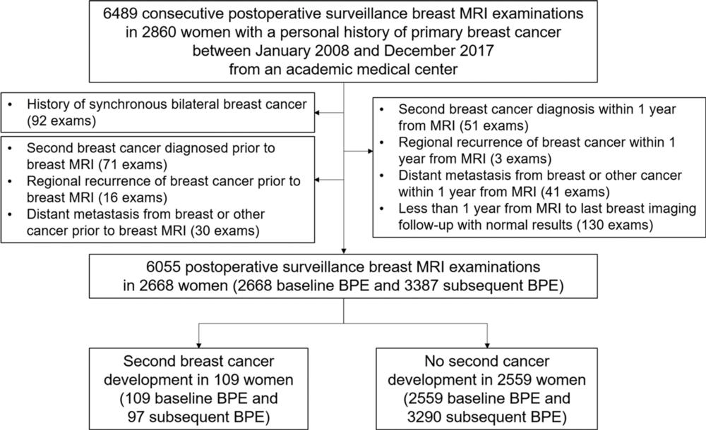 Of the 2,668 women in the study, 109 developed a second breast cancer at a median follow-up of 5.8 years. Mild, moderate, or marked BPE at surveillance breast MRI was independently associated with an increased risk of future second breast cancer compared to minimal BPE.
