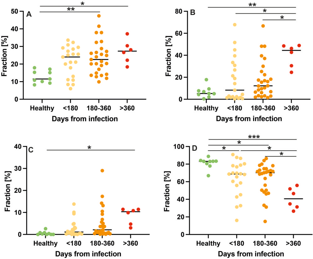 None of the COVID-19 group required hospital admission during the primary infection period. Shortness of breath, impaired attention, headache, fatigue and loss of smell were the most commonly reported symptoms at the time of the study. Results from the COVID-19 group were compared with those from nine healthy controls.