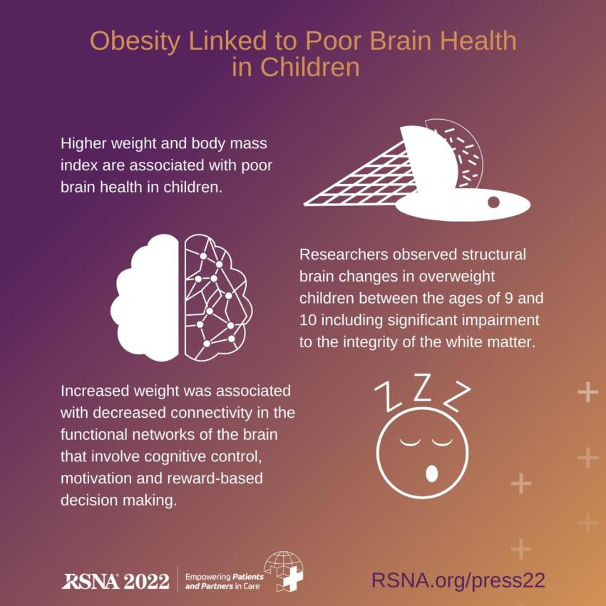 CHICAGO — Using MRI data from the largest long-term study of brain development and child health in the United States, researchers have found that higher weight and body mass index (BMI) in pre-adolescence are associated with poor brain health. The findings are being presented today at the annual meeting of the Radiological Society of North America (RSNA).