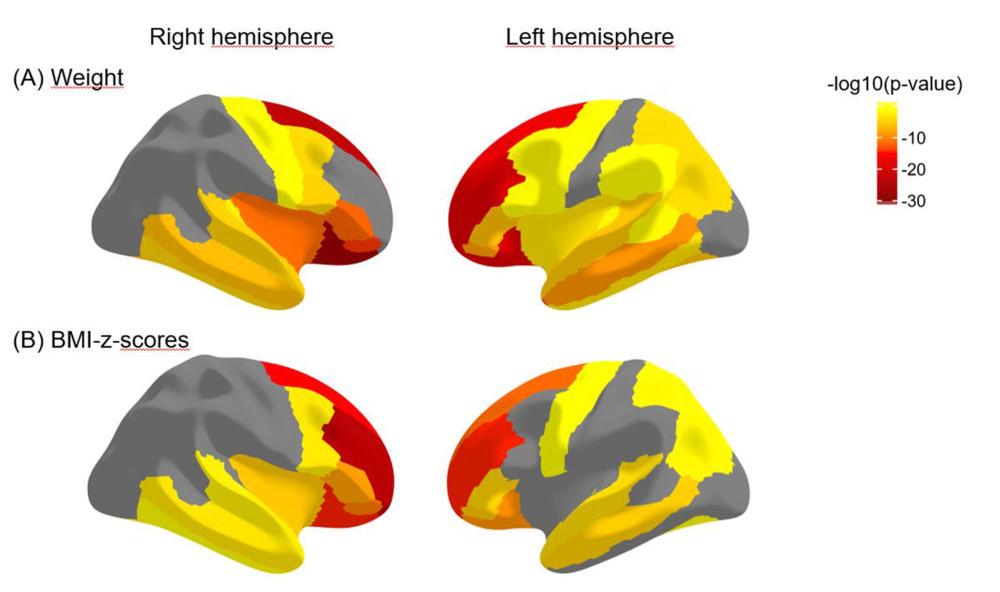 After correcting for age, sex, race-ethnicity, handedness and socioeconomic status, the research team used linear models to determine associations between weight and BMI z-scores and the imaging metrics.