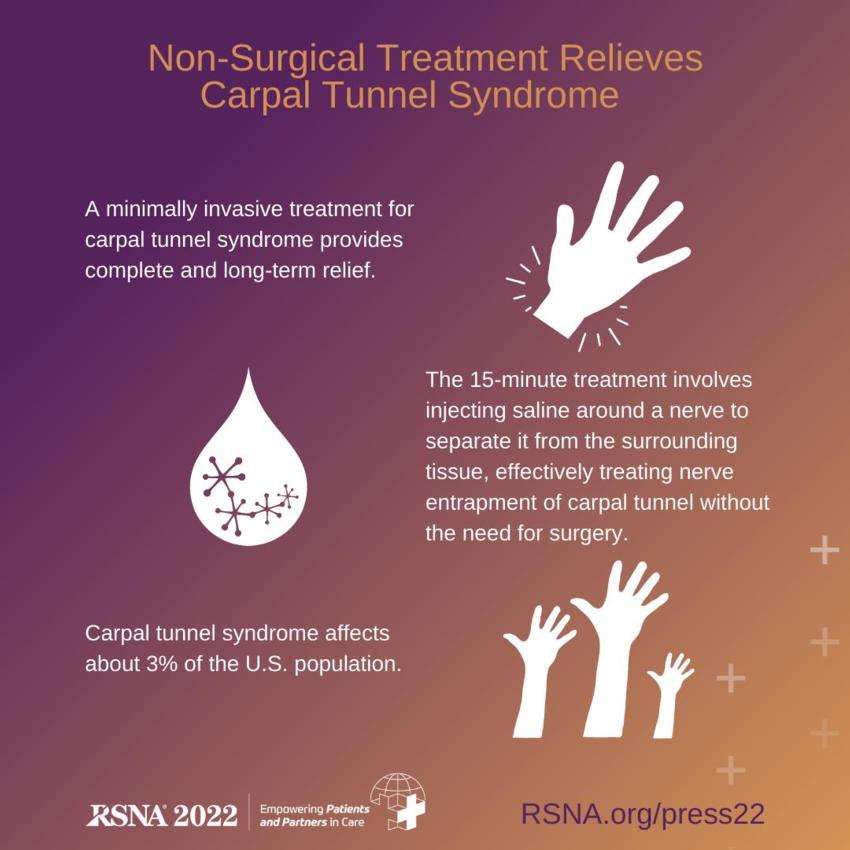CHICAGO — A minimally invasive treatment for carpal tunnel syndrome provides complete and long-term relief to patients without the use of corticosteroids, according to research being presented today at the annual meeting of the Radiological Society of North America (RSNA).