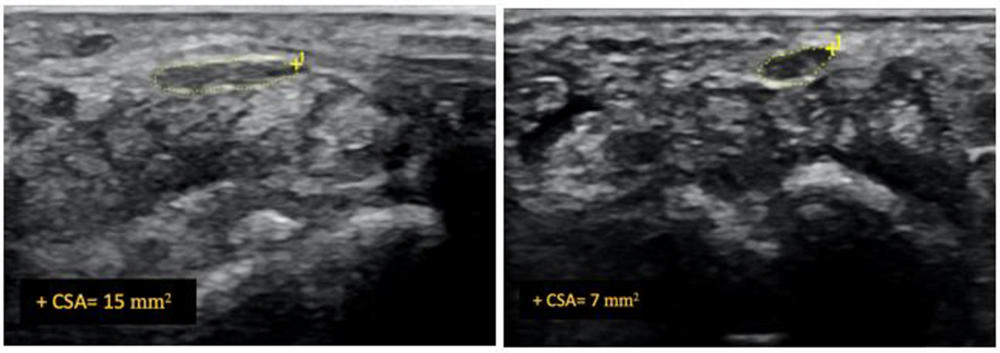 Additionally, ultrasounds showed a significant reduction of median nerve cross-sectional area in both hydrodissection groups. Group one showed a reduction of 43%, and group two showed 46%. Group three showed only an 11% reduction.