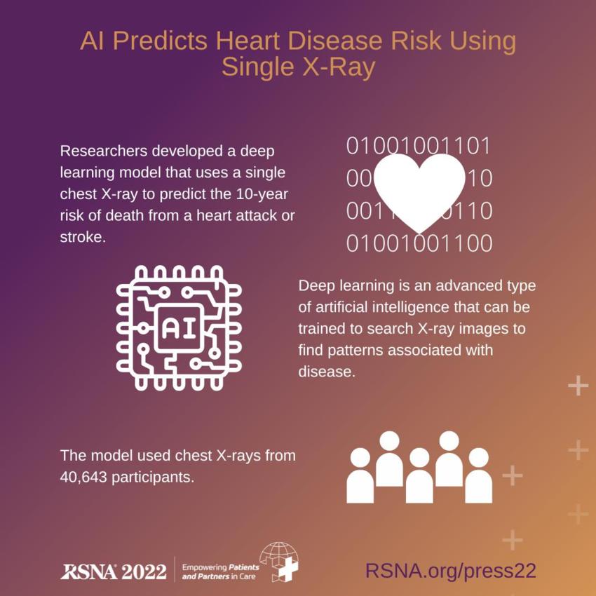 CHICAGO — Researchers have developed a deep learning model that uses a single chest X-ray to predict the 10-year risk of death from a heart attack or stroke, stemming from atherosclerotic cardiovascular disease. Results of the study were presented today at the annual meeting of the Radiological Society of North America (RSNA).