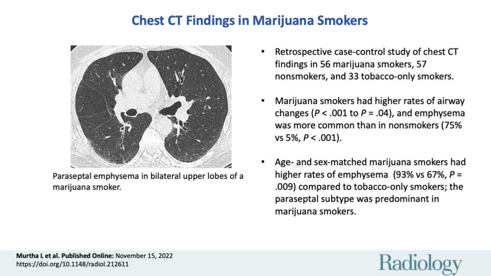 “We know what cigarettes do to the lungs,” said study author Giselle Revah, M.D., a cardiothoracic radiologist and assistant professor at the University of Ottawa in Ottawa, Canada. “There are well researched and established findings of cigarette smoking on the lungs. Marijuana we know very little about.”