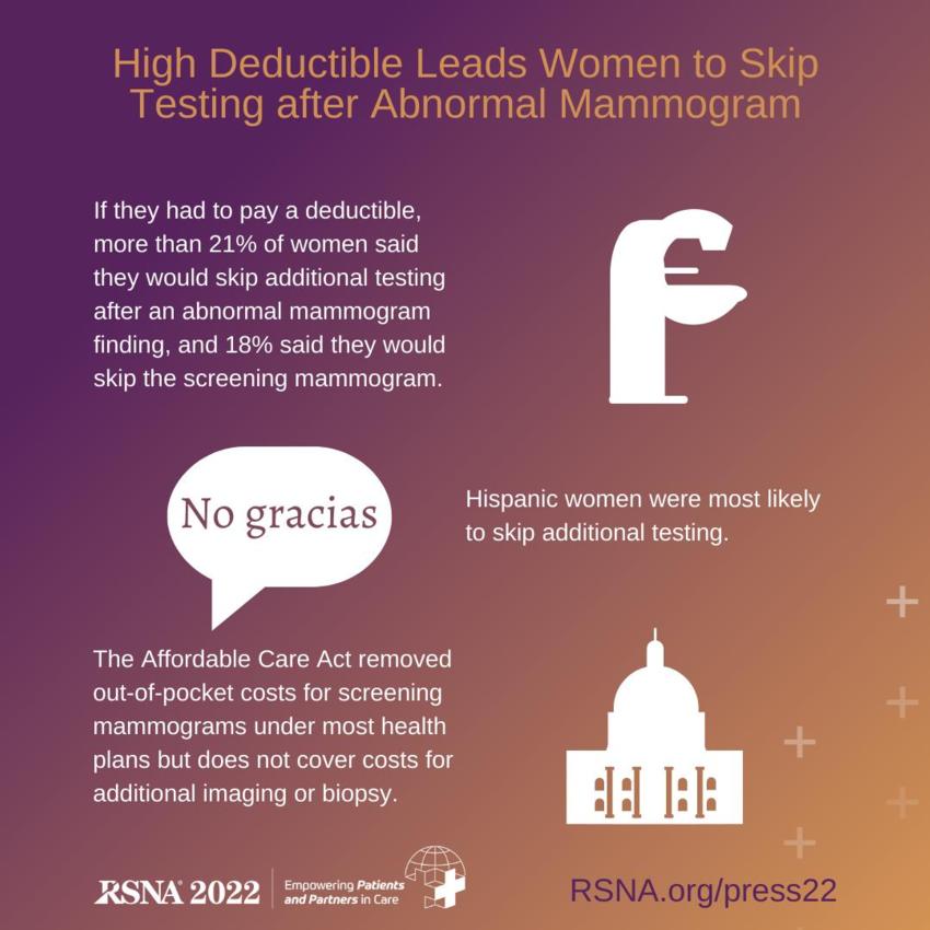 CHICAGO — One in five women is likely to forgo additional testing after an abnormal finding on a screening mammogram if there is a deductible, according to a new study presented today at the annual meeting of the Radiological Society of North America (RSNA).