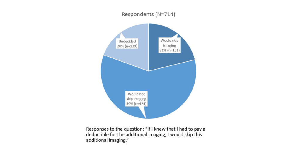 When asked whether they would skip indicated imaging if they knew they had to pay a deductible, of 714 respondents, 151 (21.2%) said they would skip imaging, 424 (59.4%) said they would not skip imaging, and 139 (19.5%) were undecided.