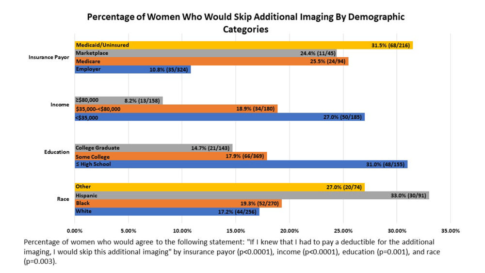 The groups with the highest percentage of responses indicating they would skip additional imaging were Hispanic (33.0%), high school educated or less (31.0%), household income less than $35,000 (27.0%) and Medicaid/uninsured (31.5%).
